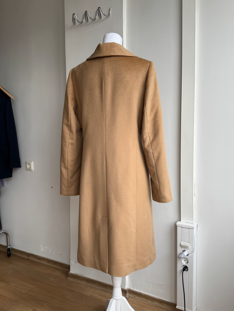 100% cashmere coat, crafted from exceptionally soft and high-quality fabric. Camel-colored with a feminine silhouette that beautifully shapes and flatters the figure. Although the brand label has been removed, the remaining composition label (in Lithuanian) indicates it was made in Lithuania, suggesting it is likely from a Lithuanian brand. With proper care, it will remain elegant for many seasons.